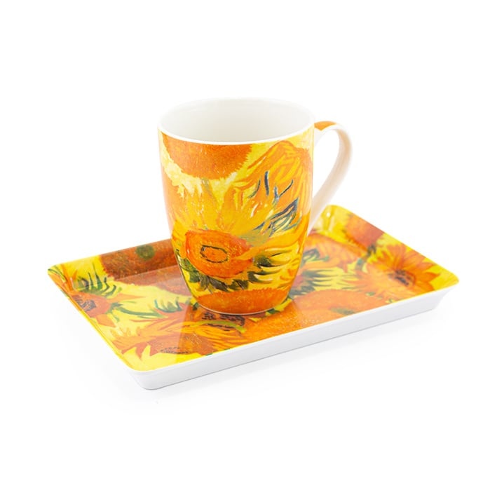 Mooie porceleine mok, in kartonnen verpakking: de mok is vaatwasmachine en magnetron bestendig. Het dienblaadje kan in de vaatwasser, niet in de magnetron. Met afbeelding van de Zonnebloemen: een beroemd schilderij van Vincent van Gogh. Te zien in het V