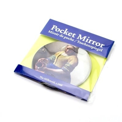 Rond spiegeltje, handig om mee te nemen bijvoorbeeld voor het bijwerken van make-up. Dit spiegeltje op zakformaat is voorzien van een prachtige opdruk van het meesterwerk van Johannes Vermeer; Het melkmeisje. Het originele werk hangt in het Rijksmuseum te Amsterdam.