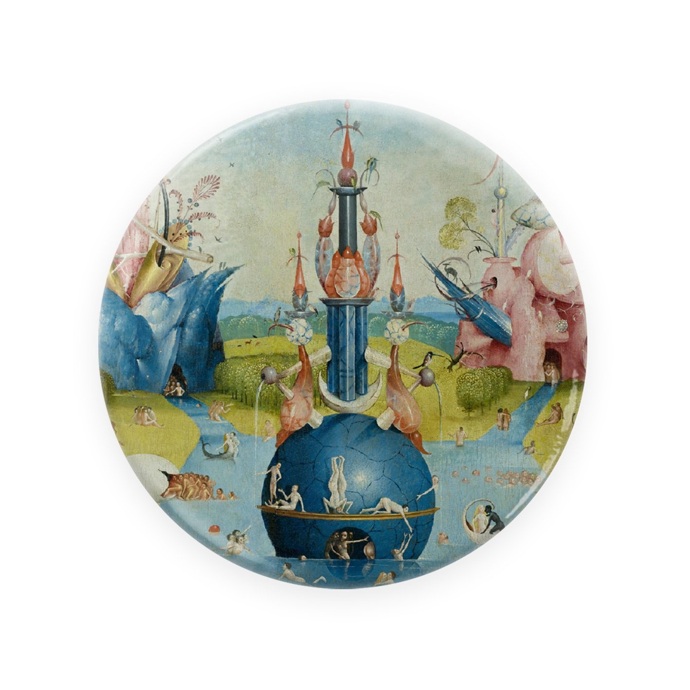 De reproductie op dit spiegeltje is van het middelste paneel van het drieluik geschilderd door Jheronimus Bosch: uit de collectie van het Prado te Madrid, Spanje.
